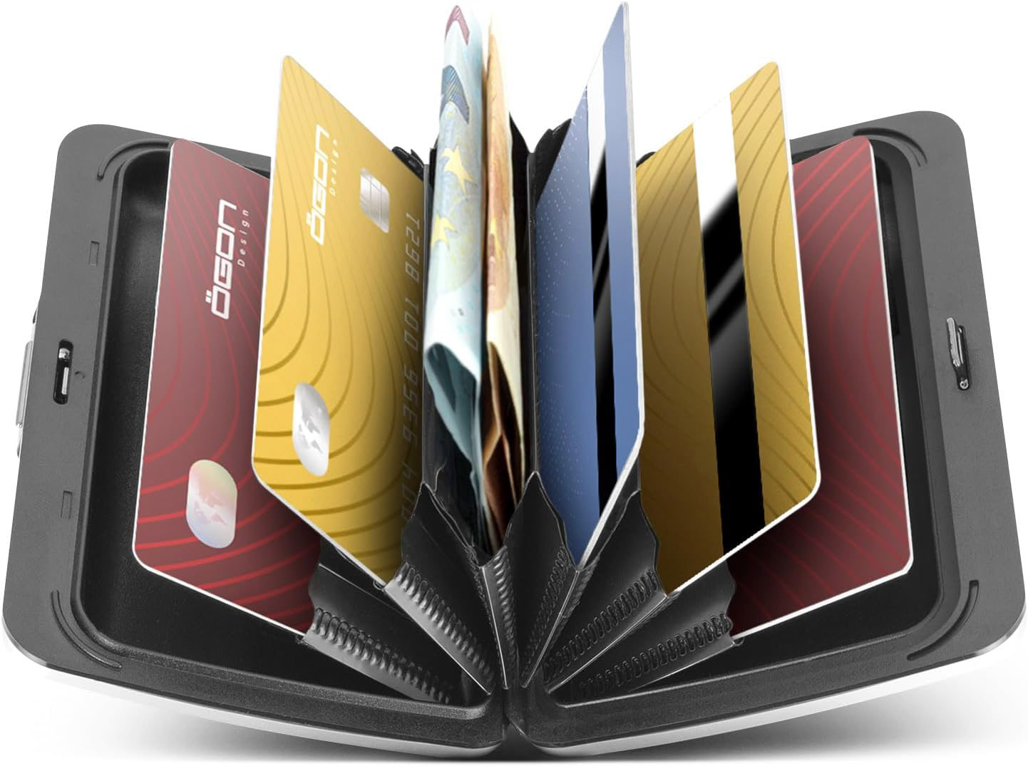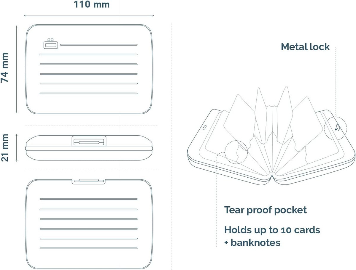 RFID Blocking Card Holder 1. Metal locking mechanism 2. Hold up to 10 cards and notes 3. Water resistant 4. Easy access to cards 5. Aluminum case